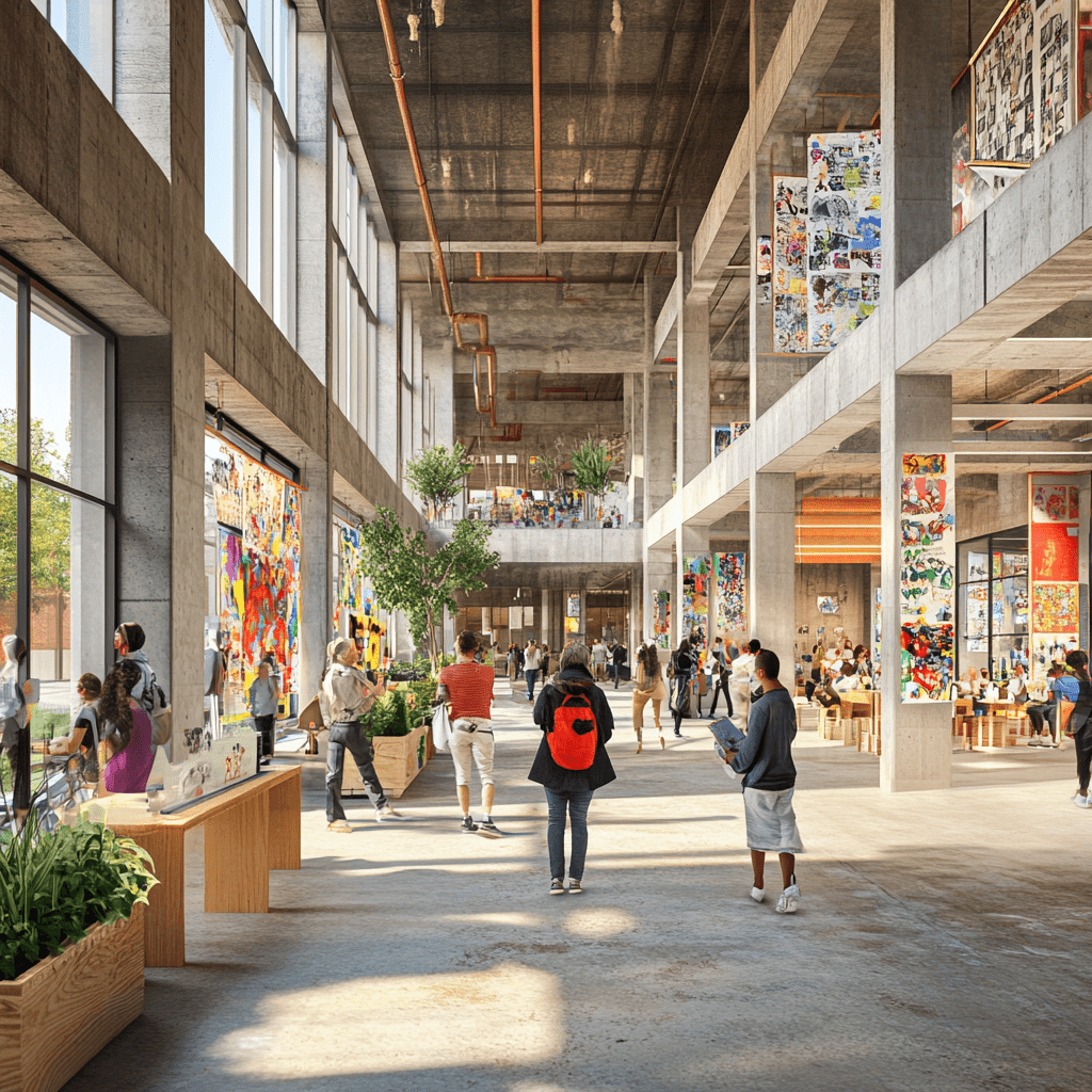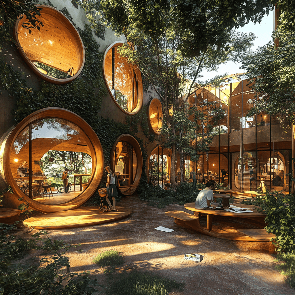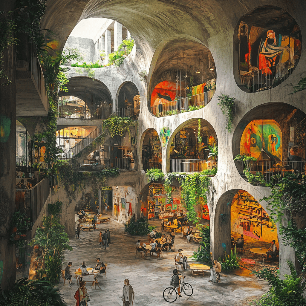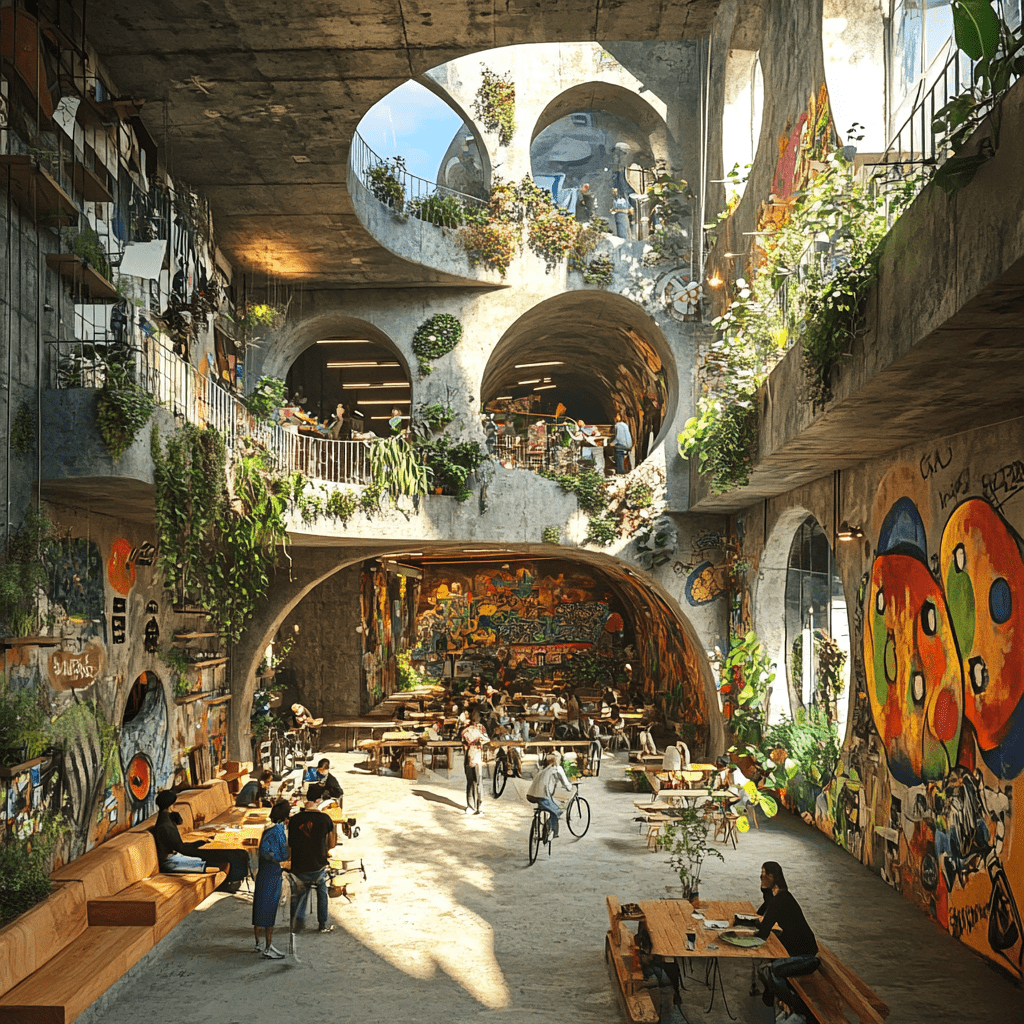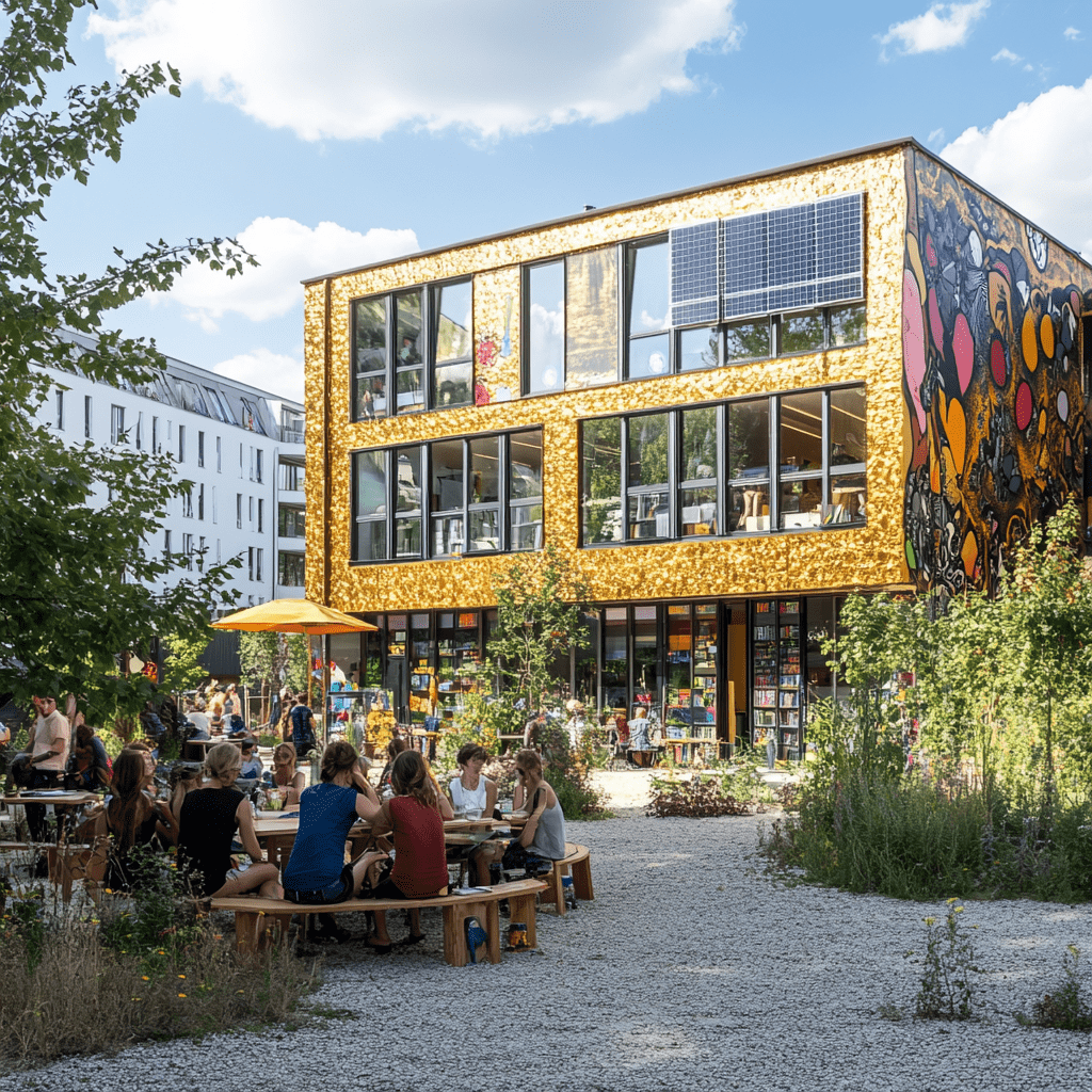 Wie könnten also diese Gemeinschaftszentren der Zukunft aussehen, in denen wir zusammen lernen, arbeiten und spielen? Ich habe Midjourney zu Rate gezogen und einige Bilder auf Grundlage meiner Ideen entworfen. Wichtige Kriterien für mich persönlich waren: