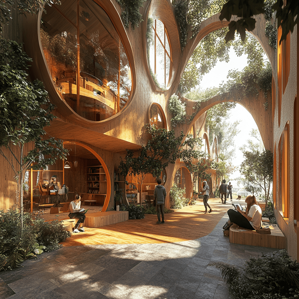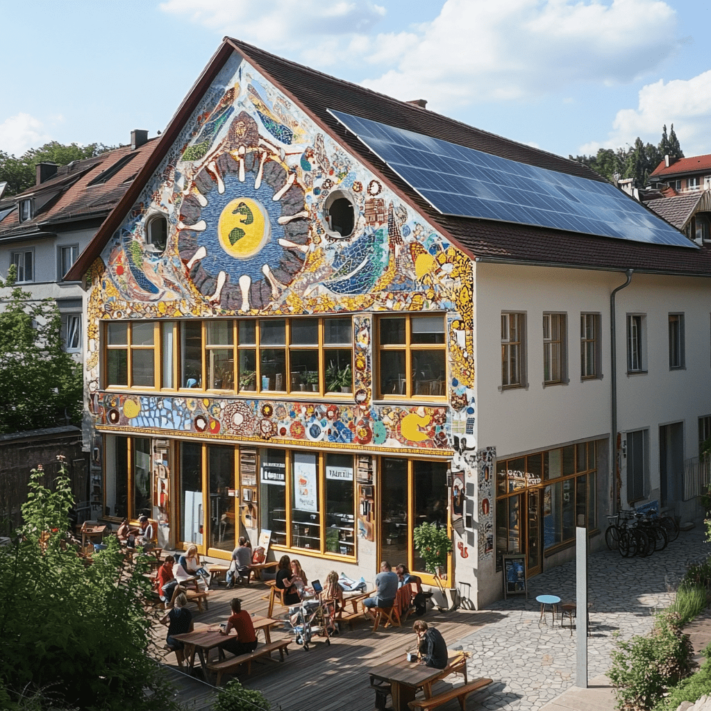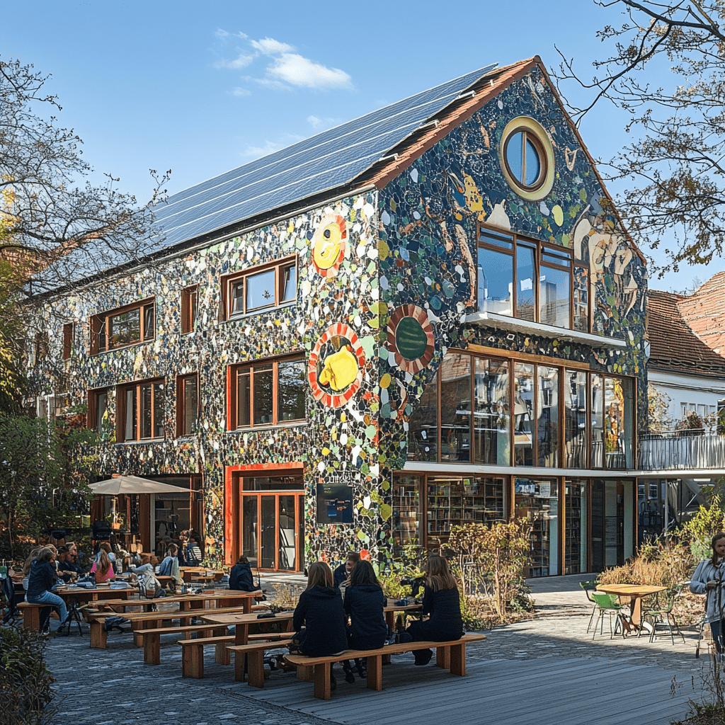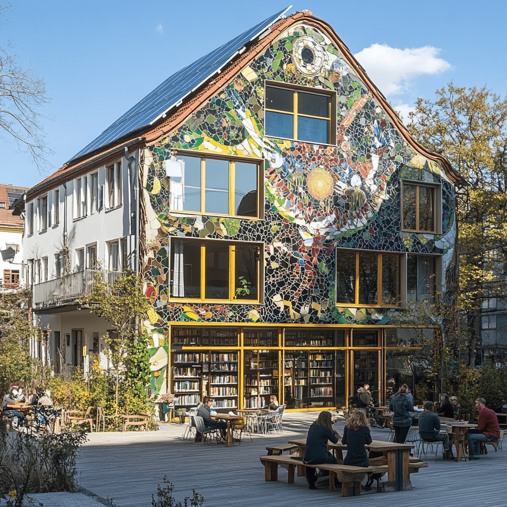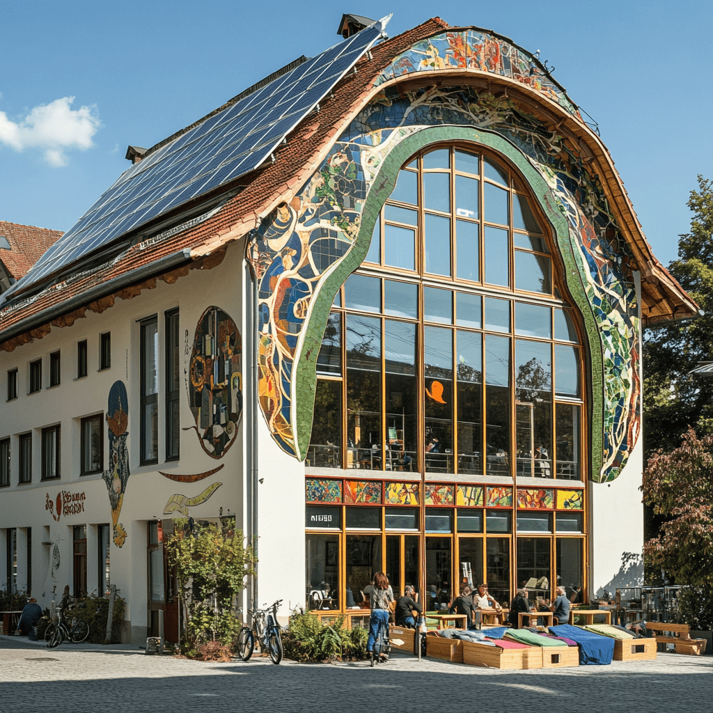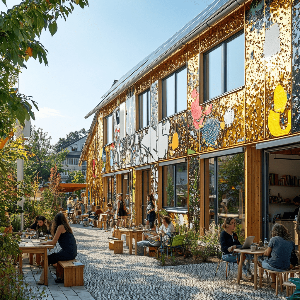 Wie könnten also diese Gemeinschaftszentren der Zukunft aussehen, in denen wir zusammen lernen, arbeiten und spielen? Ich habe Midjourney zu Rate gezogen und einige Bilder auf Grundlage meiner Ideen entworfen. Wichtige Kriterien für mich persönlich waren: