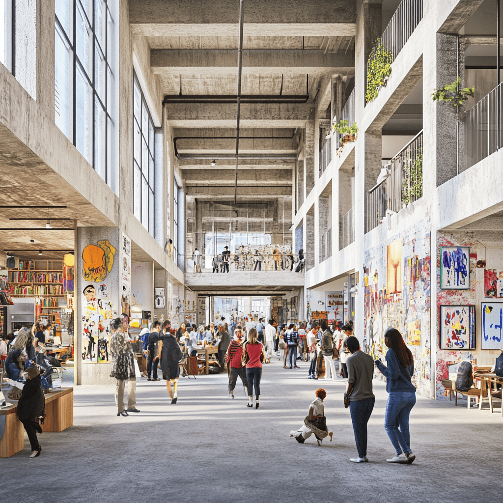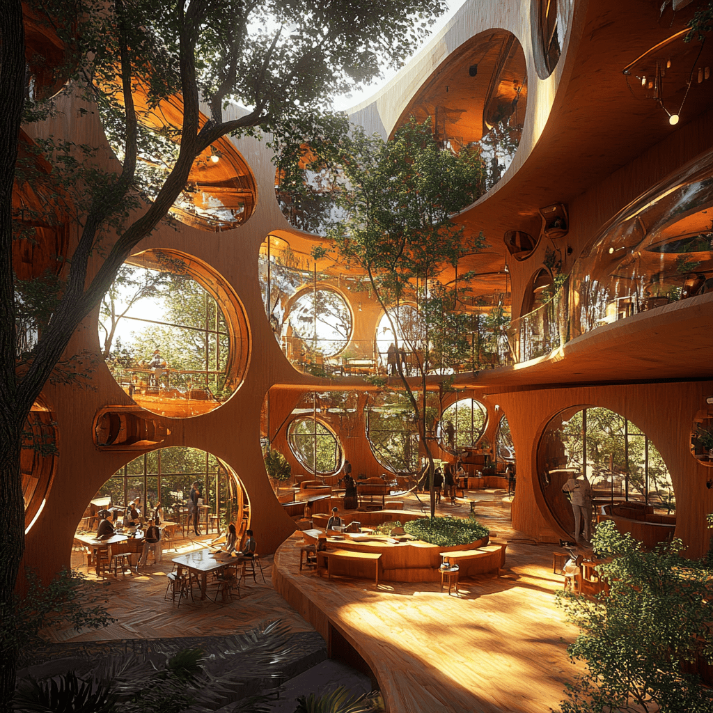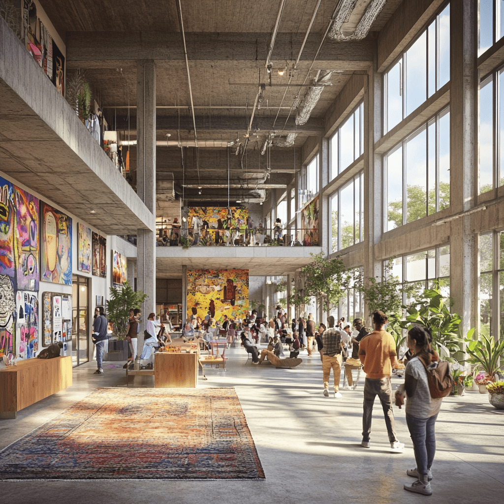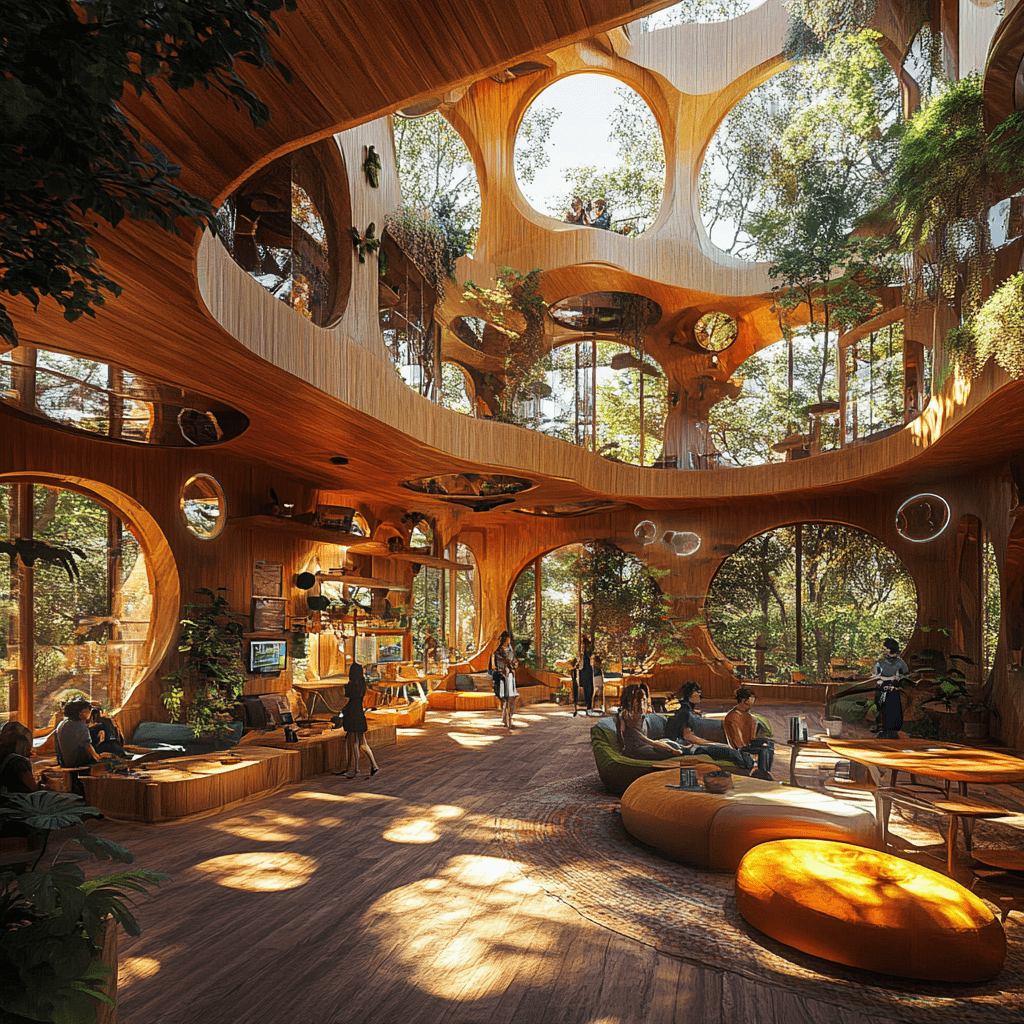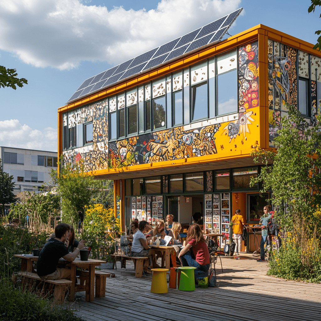 Wie könnten also diese Gemeinschaftszentren der Zukunft aussehen, in denen wir zusammen lernen, arbeiten und spielen? Ich habe Midjourney zu Rate gezogen und einige Bilder auf Grundlage meiner Ideen entworfen. Wichtige Kriterien für mich persönlich waren: