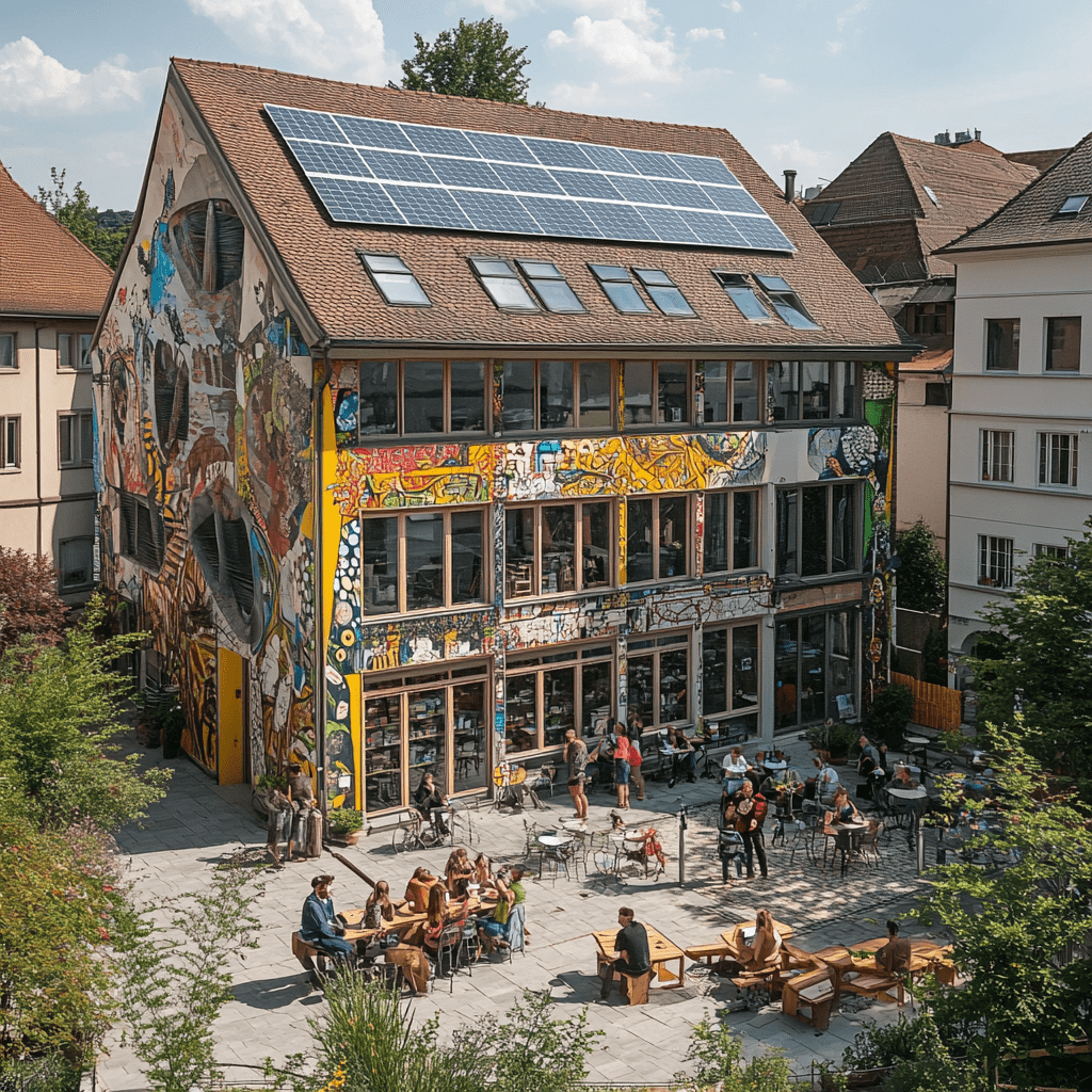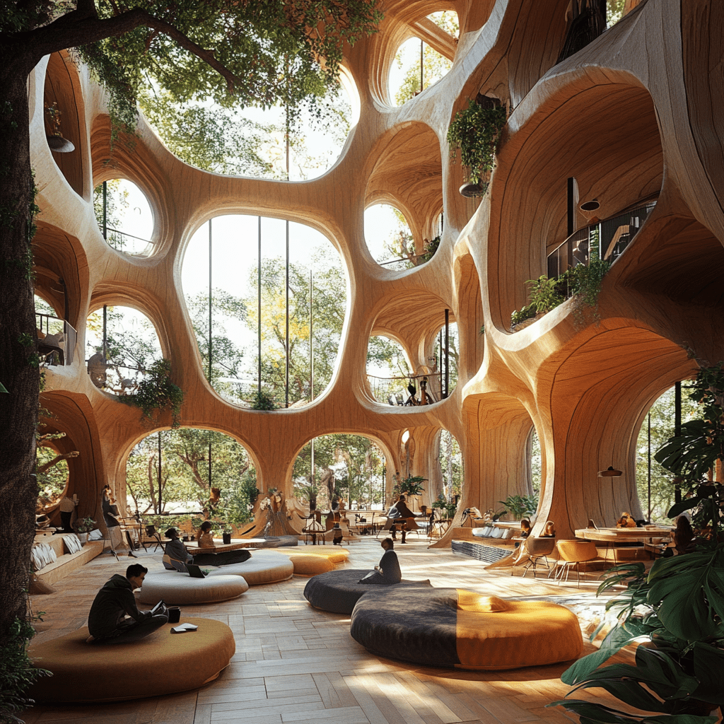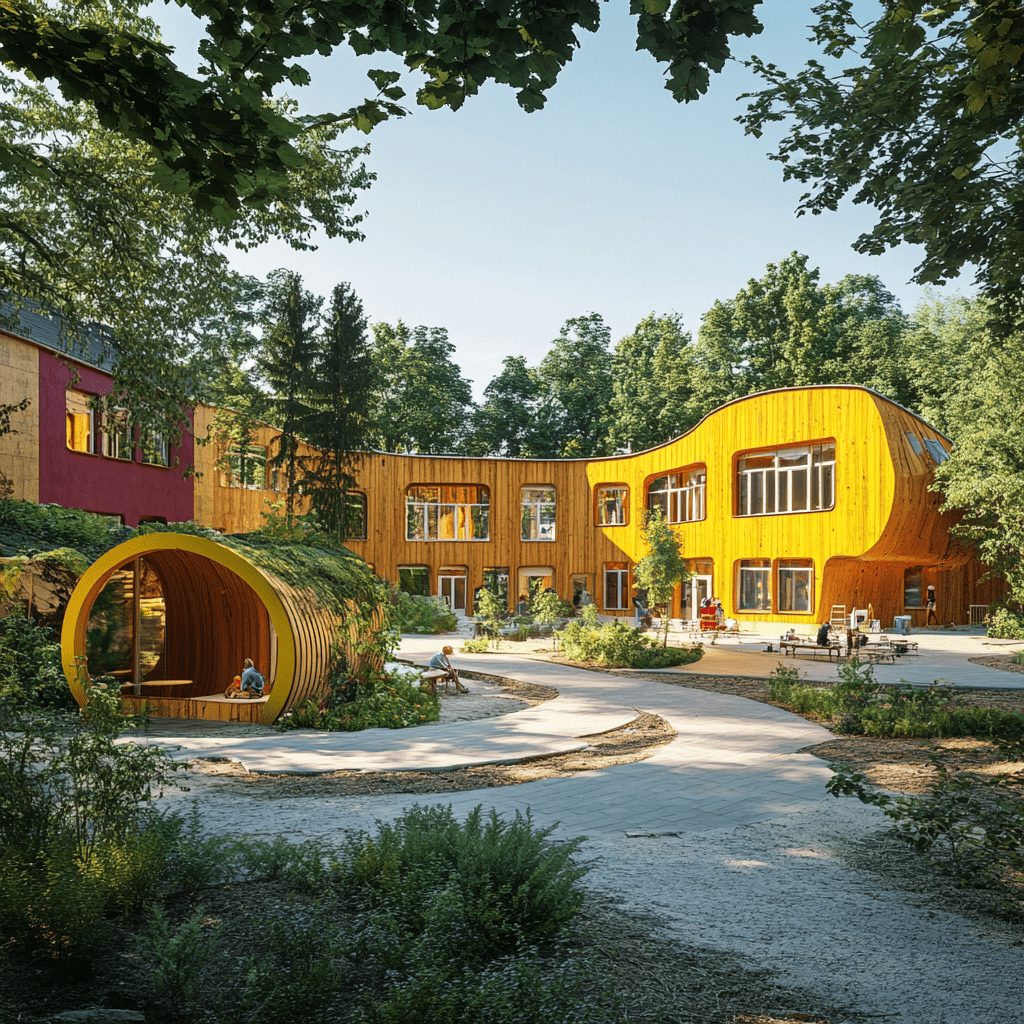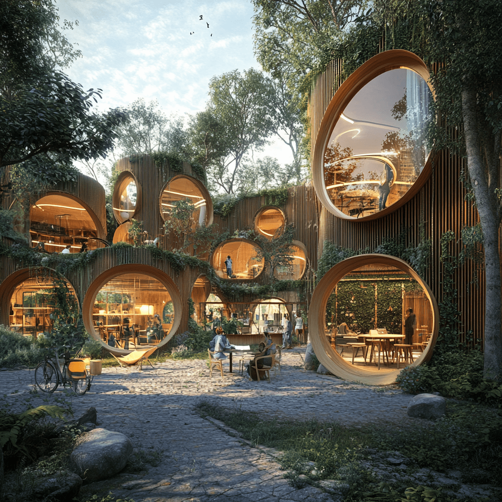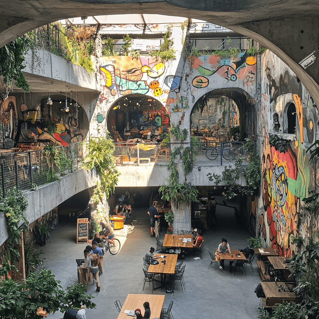 Wie könnten also diese Gemeinschaftszentren der Zukunft aussehen, in denen wir zusammen lernen, arbeiten und spielen? Ich habe Midjourney zu Rate gezogen und einige Bilder auf Grundlage meiner Ideen entworfen. Wichtige Kriterien für mich persönlich waren: