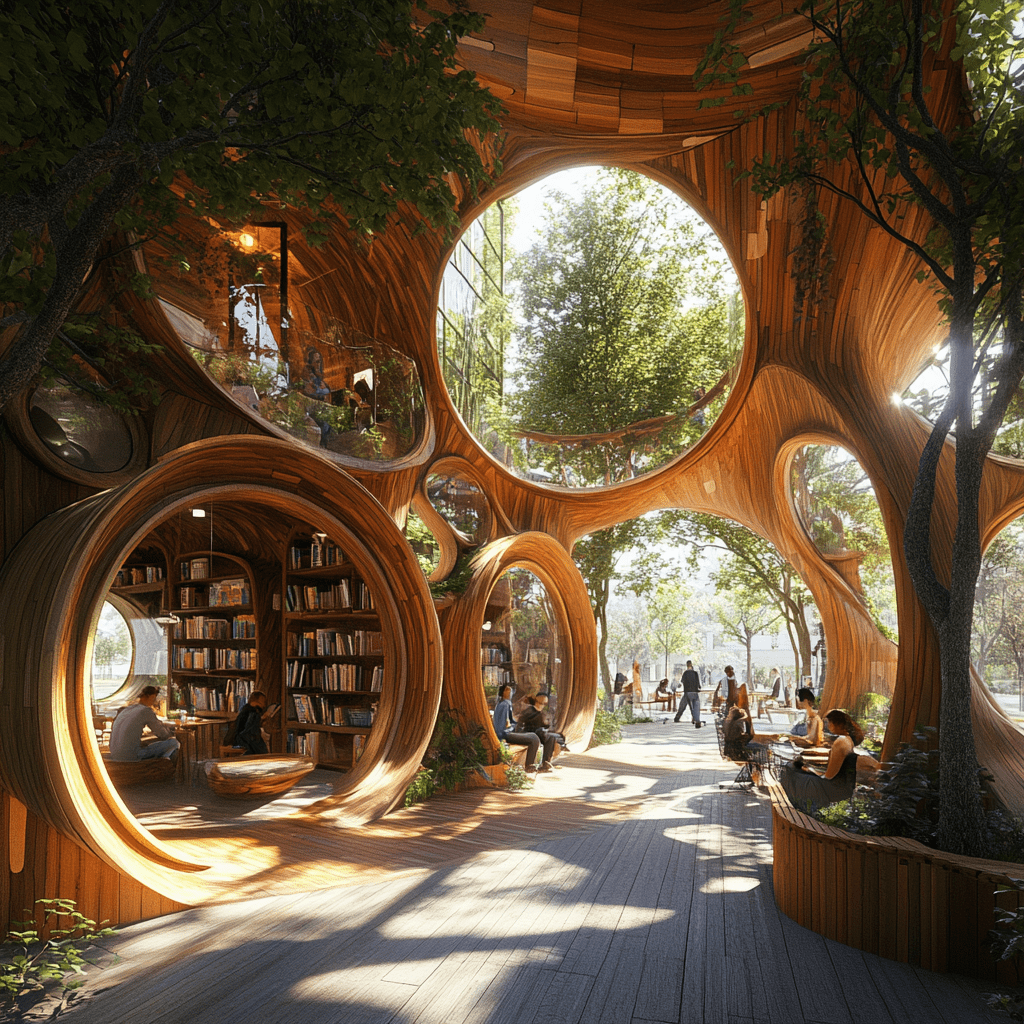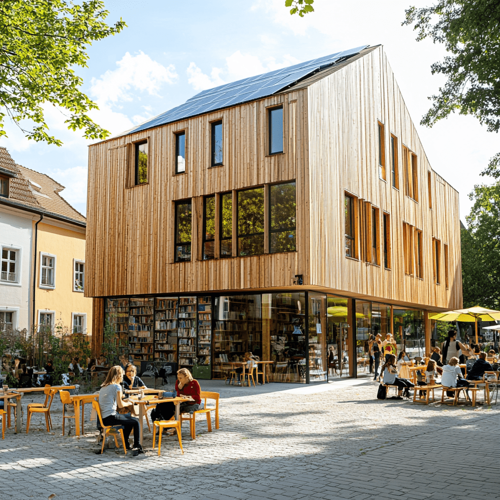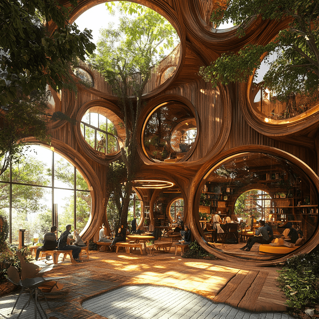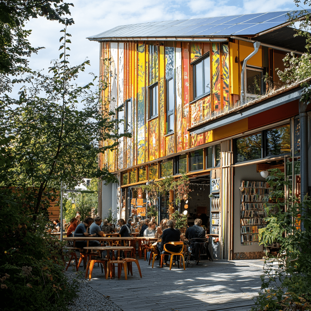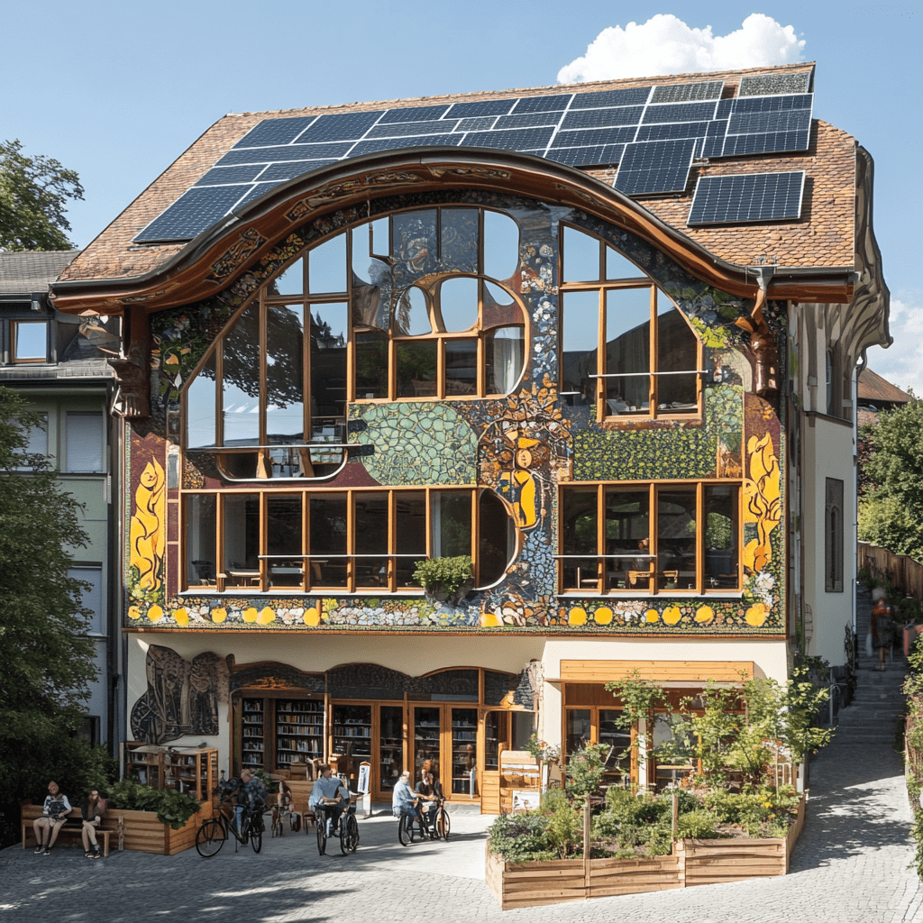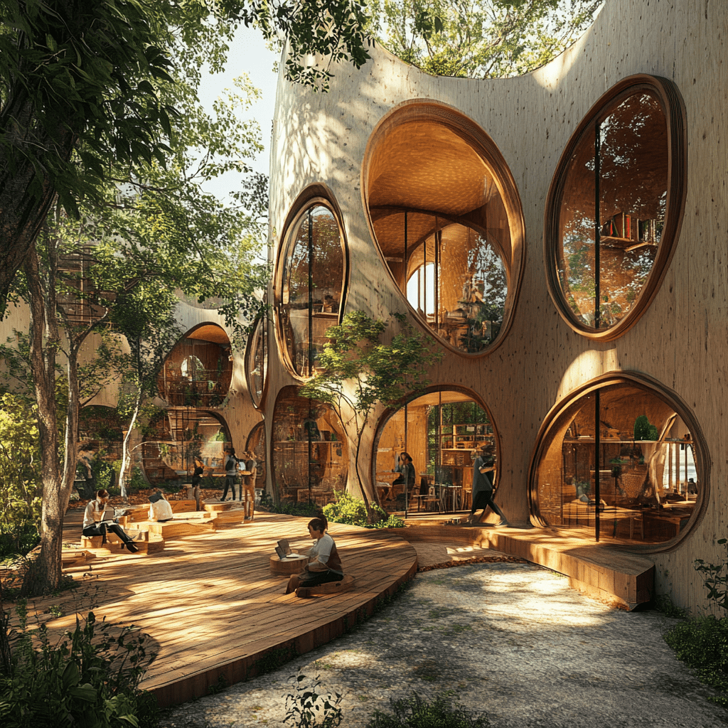 Wie könnten also diese Gemeinschaftszentren der Zukunft aussehen, in denen wir zusammen lernen, arbeiten und spielen? Ich habe Midjourney zu Rate gezogen und einige Bilder auf Grundlage meiner Ideen entworfen. Wichtige Kriterien für mich persönlich waren: